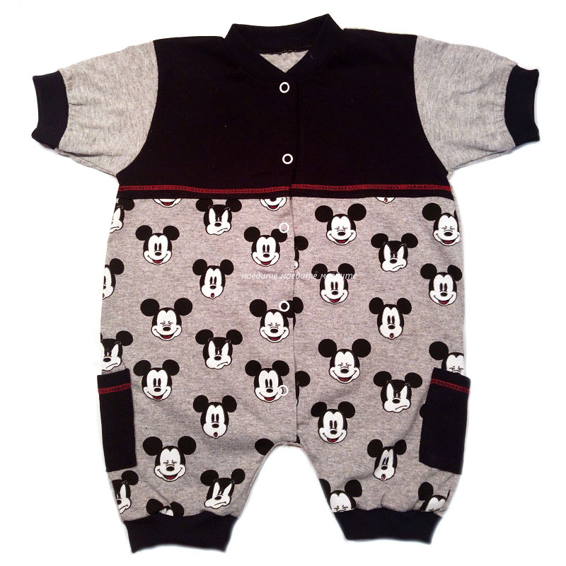 "МоёДитё" песочник на мальчика "Микки Маус" М381 с короткими рукавами, спереди на кнопочках, штанишки снизу на манжете, сбоку с накладными карманами.